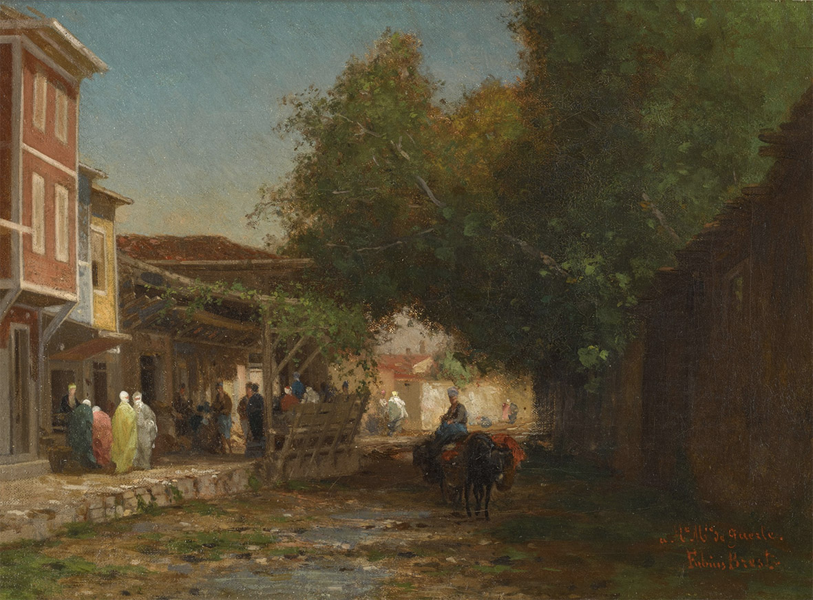 The only Turkish work, Lot 45, is a street scene of great charm by Fabius Brest (1823–1900), who spent just four years in Turkey from 1855 to 1859, but spent the rest of his career reliving the experience in numerous capriccios in oil, some highly fanciful. This work is true to life in Istanbul in the 19th century. It is dedicated to ‘Me Mme Guerle’ but undated.