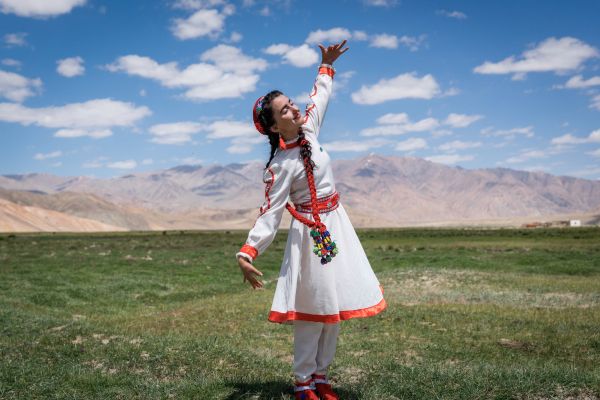 A girl in traditional Tajik clothes dances at the opening ceremony of a new tourism centre in the Pamir Mountains of Eastern Tajikistan. Photo: Christopher Wilton-Steer, 2019