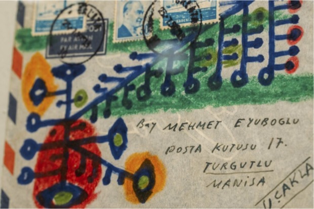 Bringing forth letters dated between 1954-1970, Casa Botter’s exhibition extends the focus beyond Eyüboğlu’s canvases, instead foregrounding Eyüboğlu’s mastery in seamlessly blending art and written word. A selection of Eyüboğlu’s letters exchanged between his family members as well as known figures such as Nazım Hikmet, Fikret Mualla and Mustafa Pilevneli addressed to and from France, US and Canada are on display. Each envelope also doubles as miniature artworks adorned with recurring abstract motifs of nature and self-portraits, made using different mediums. This exhibition while offering an intimate portrait of the artist also offers a dialogue with the companion exhibition “Yan Yana” taking place at the İstanbul Painting and Sculpture Museum exhibition diagonally cross Casa Botter, featuring works by the artist.