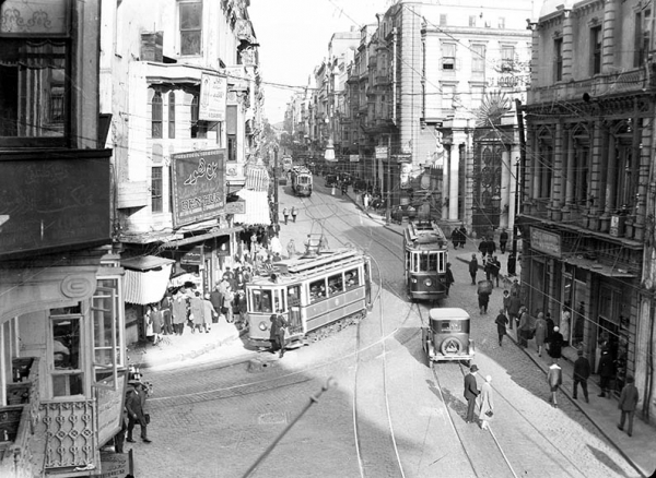 Seen here is Galatasaray Meydanı, with the gates of the lycée on the right. Nowadays, a solitary tram makes its way back and forth between Taksim and Tünel.