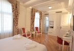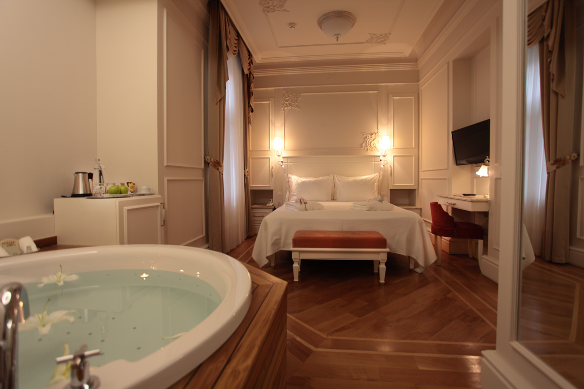 Despite all this history the hotel is very much of the moment, with a bistro-style restaurant and bar occupying what were the ground-floor rooms at the front and a small art gallery at the back. The original marble staircase survives but lifts whiz guests up to spacious modern rooms offering every comfort, especially for those who enjoy a Jacuzzi in their bathroom. Inevitably, the suites scoop the most space, enough to have their Jacuzzis installed in hot-tub like decking in separate bathrooms with underfloor heating. The décor is stylish but discreet; no over-the-top Ottomania here. This being a new hotel there are plenty of electric sockets for all the new gadgets without which we can no longer travel.