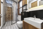Two of the apartments share access to a small outdoor deck with a giant fish tank, a welcome feature for summer. Otherwise, there’s a roof terrace with views too.