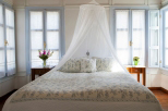 Zeynep Öziş’s delightful hotel and the house she built next door, in the same impeccable vernacular, featured in Berrin Torolsan and Solvi Dos Santos’s book of contemporary Turkish interiors, At Home in Turkey: ‘The ground floor of the house, which was used by previous owners as an olive-depot lined with huge terracotta vessels, serves today as a spacious and welcoming lobby and a library with a log fire and deep sofas, while the living quarters upstairs are transformed into bedrooms that are bright and delightful. Some rooms look down into the garden, with its small swimming pool shaded by cypresses, honeysuckle, jasmine and plumbago. Others look across the street to neighbouring gardens. The colour scheme, apart from the unplastered stone chimney breasts and plumbago-blue painted shutters, is many shades of white: whitewashed stones walls, white linen chair covers, white piqué beadspreads and white muslin curtains. The occasional piece of antique furniture – a chest of drawers Zeynep inherited from her family, an old wardrobe or a little drawing accentuate the cloud-like atmosphere… Thanks to Zeynep, this windy corner of the Aegean has become not only a mecca for sporty windsurfing types, but also a romantic literary retreat.’
