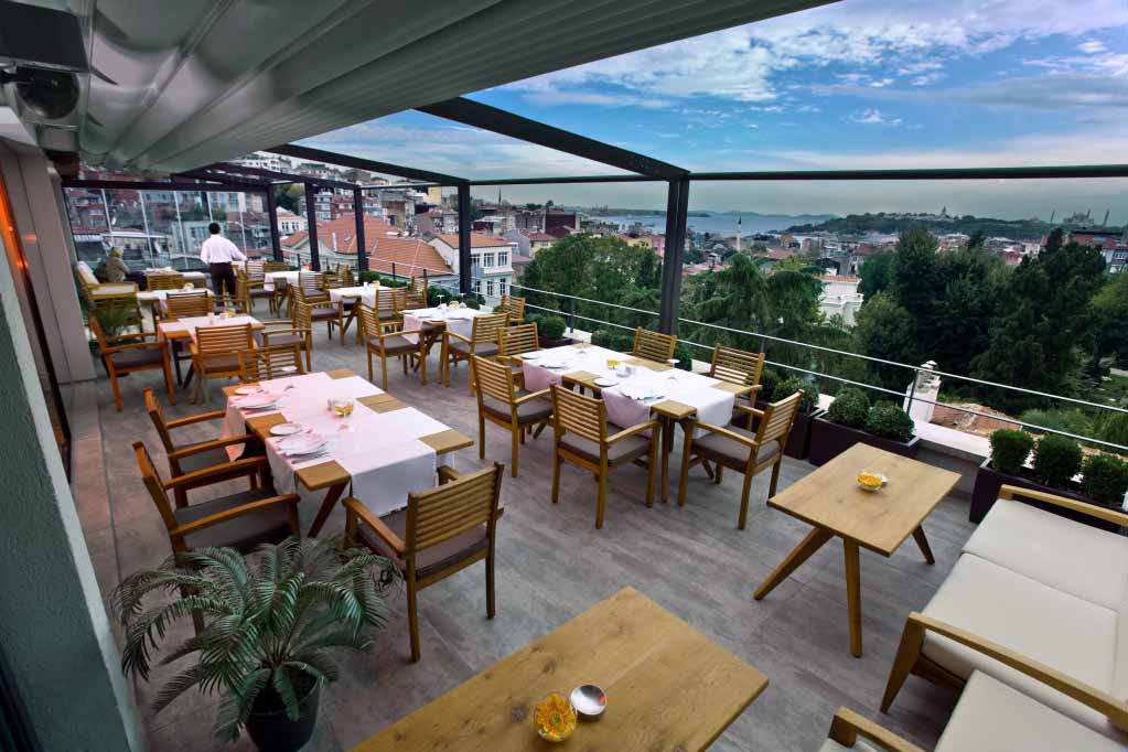 The real pleasure of the hotel, however, is the fabulous views it affords of Istanbul’s historical peninsula. In some of the rooms, you can lie in bed looking at Aya Sofya on the other side of the Golden Horn. Bright, comfortable bedrooms are in mild contrast to the slightly institutional, pastel feel of the downstairs lobby and breakfast room. Here, there is an over-reliance on the vivid, naive canvases of the painter Memduh Kuzay to give the place some oomph. You can escape all this on the remarkable roof terrace, where the view is the best of all. This is home to La Mouette Restaurant, which serves new Turkish cuisine.