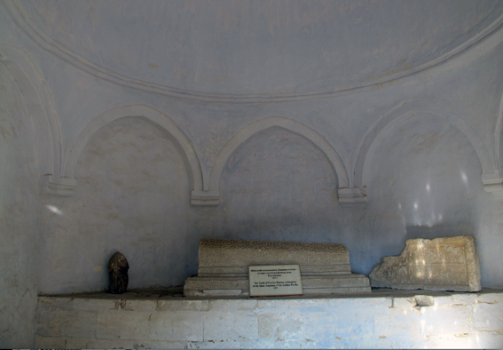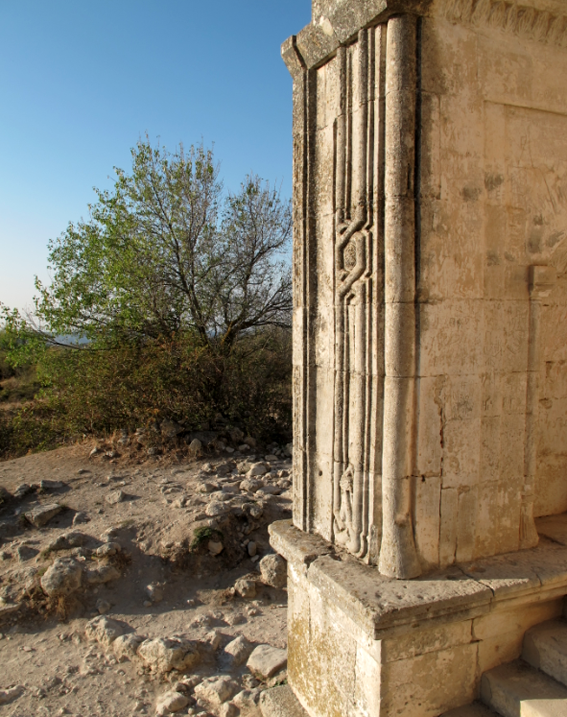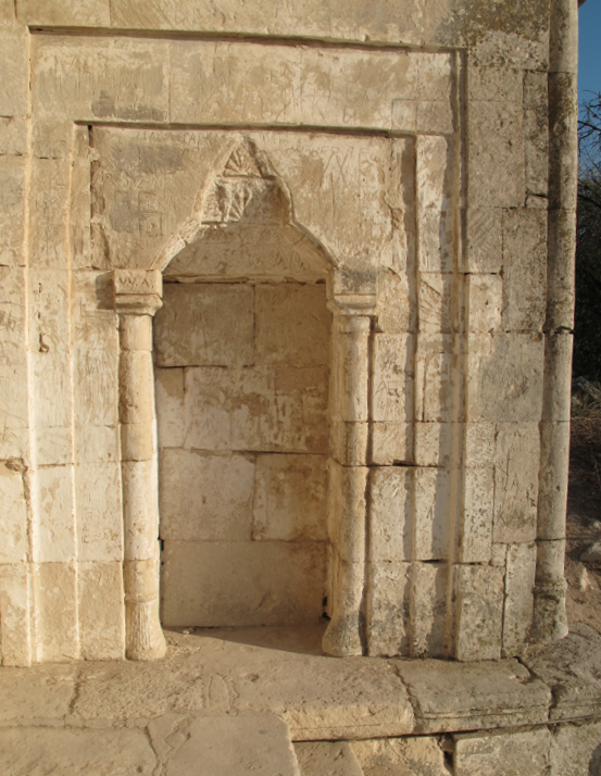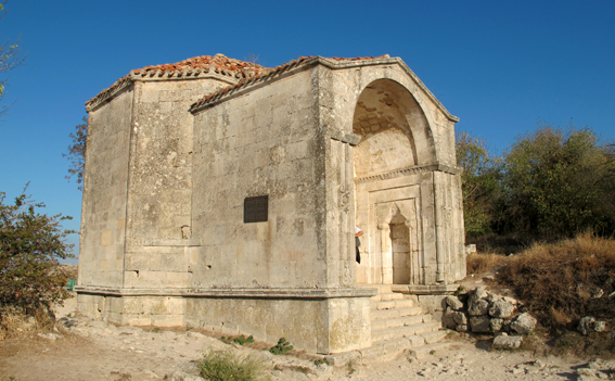 Her mausoleum is an octagon in plan, like the tomb of Hacı and Mengli Giray Khan, constructed, or reconstructed, at Salacık in the valley below Chufut Kale. It stands on the plateau outside the walls of Chufut Kale, with cliffs on either side – truly a tomb with a view. It is in excellent condition and is one of several fine examples of the Seljuk architecturural style in Crimea (see Oleksa Haiworonski). The portal is decorated with stone carving and flanking mihrab niches.