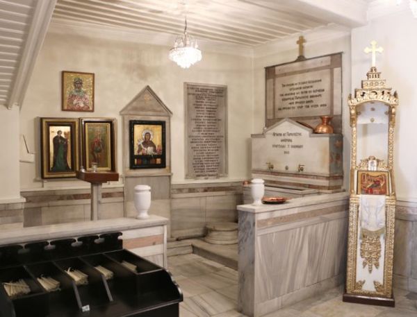 The courtyard is covered with decorative pebble mosaic and the narthex entrance has recently been refurbished. The interior is dwarfed by sizeable chandeliers. In the frames on the upper part of the iconostasis are scenes from Jesus’ life. On the lower part are depictions of Panagia Genethlion, the Virgin Mary and Child Jesus, Jesus and Ioannes Prodromos. The front surface of the arches facing the narthex is covered with the Apostles’ portraits. The apses half-dome is decorated with a beautiful Platitera Mary depiction. The front façade of the gallery is covered with striking scenes from the Bible.