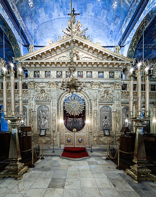 The north of the bema (raised platform) is dedicated to Panagia Zoodokhos and the south to Panagia Evangelistria. In the small frames on the upper part of the iconostasis are scenes from Jesus’ life. On the lower part are depictions of Panagia Eiosdoion, the Virgin Mary and Child Jesus, Jesus and Ioannes Prodromos. In the medallions on the wooden ambo, Jesus and the four writers of the Gospels are depicted. The narthex is embellished with Christ Pantokrator and the arch with the Apostles’ portraits.