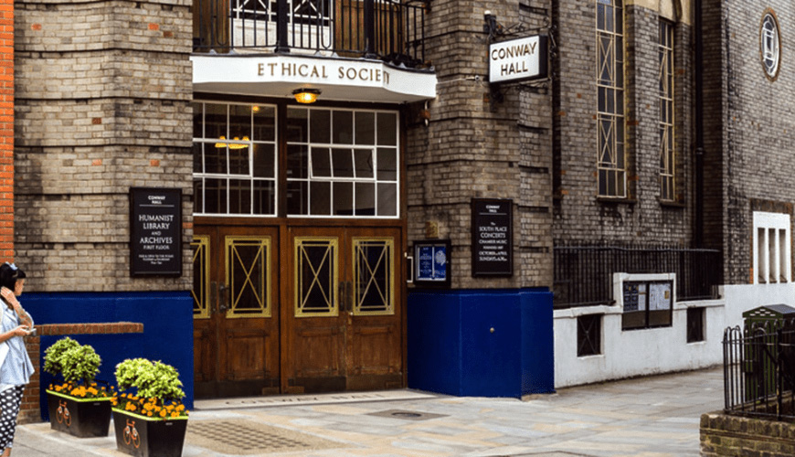 The Conway Hall is owned by the Conway Hall Ethical Society and is situated on historic Red Lion Square in Holborn, central London. It stages concerts, talks and exhibitions.