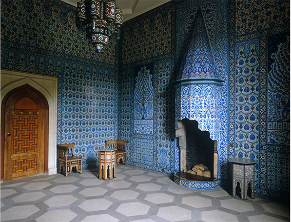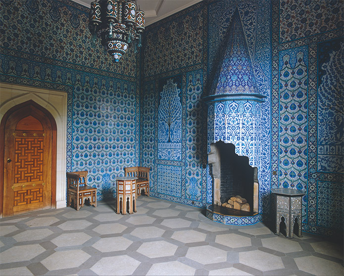 These were all to go back into the reconstruction, which was also to contain a room inspired by Mark’s travels. His first idea was for a Turkish room, probably influenced by some of the beautiful Ottoman rooms he had seen on his travels, such as the 18th-century house of the Arzeb family in Hama, Syria, which he described as “a triumph of the combined skill of artists, workmen and architect”…
