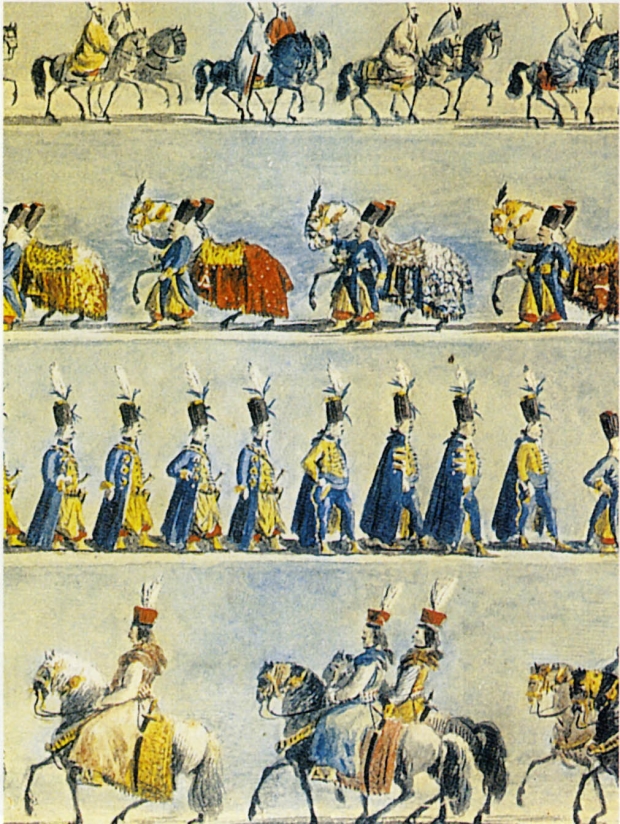 Except for relatively short periods of warfare in the seventeenth century (1620–1, 1672–6, 1683–99), often provoked by marauding Cossacks and Tartars rather than the powers themselves, Poland and the Ottoman Empire were generally peaceful neighbours. They shared the bonds of commerce and hostility to Russia. The embassies sent by the Polish kings to Ottoman sultans were, as many pictures and prints in the catalogue make clear, particularly grandiose. At his entry into Istanbul in 1622, the Polish ambassador was accompanied by 1,000 horsemen.