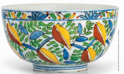 Kütahya ceramics are easily distinguished from the more formally decorated Iznik wares. Finely potted, generally quite small pieces with a thin white body are painted in a palette of bright colours in an exuberant but sketchy style, sometimes rather unfairly described as “rustic”. New designs included quaint human figures dressed in contemporary fashions, and patterns inspired by imported Indian textiles and by Japanese and Chinese porcelains. A wide range of shapes included every type of domestic object: inkwells and pen boxes, pilgrim flasks and rosewater sprinklers, dishes and bowls. Most ubiquitous are the pots, cups and saucers used for coffee. In Ottoman documents Kütahya potters are frequently referred to as fincancı, “coffee-cup makers”.