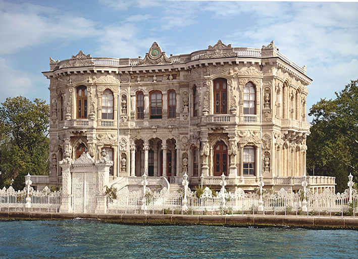During the reign of Abdülmecid’s brother and successor, Abdülaziz, the restrained Neoclassical exterior – still visible at the back – became more eclectic, with a plethora of Rococo embellishments. Scrolls, acanthus leaves, bunches of grapes, garlands, torches, vases, festoons, fluted columns, all intricately carved in marble and sandstone, were added to the three façades visible from the water. As the 19th-century French writer Théophile Gautier put it, these Bosphorus palaces are “close to the style the Spanish call ‘plateresco’, which makes a monument’s façade resemble a large piece of luxurious gold jewellery, with its profusion of complex ornamentation and mad details”.