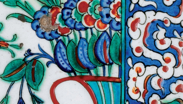 A tile (detail pictured) also from the second half of the 16th century, depicts an Iznik vase spilling over with flowers and has a strong Chinese cloudband border. The tile, part of a panel, was bought by the Sadberk Hanım Museum in 2006.