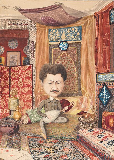 Thanks to the roles he played in the busy diplomatic scene and to family connections, Yusuf enjoyed rare access to the private world of Pera’s crème de la crème. Among his entourage were ambassadors and chargés d’affaires. As one of them, the French diplomat Gabriel Hanotaux, related, “Youssouf was an amiable man, an excellent despatch writer, a skilled draughtsman, a witty cartoonist, a man about town, an enthusiastic bridge player who used to soundly beat the secretary of the Greek legation.” He also enjoyed the company of the most influential figures in Ottoman society and the patronage of two grand viziers, Tevfik Pasha and Said Pasha, as well as the friendship of the Levantine bankers of Galata. Unique, however, was his talent for caricature and his desire to satirise the “types” he encountered in his social world.