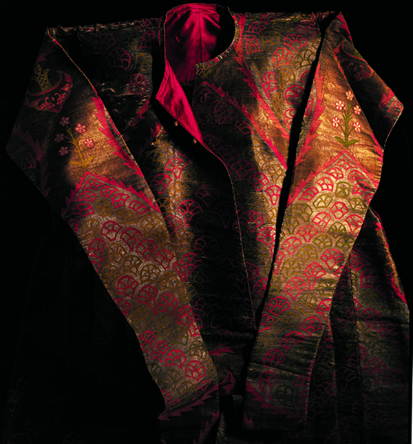 The kaftan, with its large pomegranate motifs, dates from the second half of the 16th century and also appears as a detail – but not in its entirity, with its ceremonial long sleeves – in the pages of ‘Ipek: Crescent and Rose’, a magnificent book by Nurhan Atasoy, Walter B Denny, Louise W Mackie and Hülya Tezcan. This magnificently illustrated, scholarly work suggests that this was the exquisite seraser fabric with gilt-metal ground that dazzled the Englishman Thomas Dallam, who, when he delivered an organ as a gift to the sultan on behalf of Elizabeth I, describes how the sultan and his court were attired in ‘clothe of goude’.