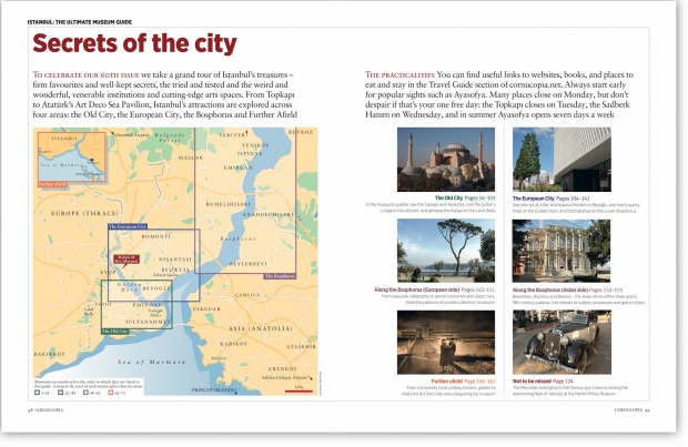 Buy/gift a digital subscription Login to the Digital EditionTo celebrate our 60th issue we take a grand tour of Istanbul’s treasures – firm favourites and well-kept secrets, the tried and tested and the weird and wonderful, venerable institutions and cutting-edge arts spaces. From Topkapı to Atatürk’s Art Deco Sea Pavilion, Istanbul’s attractions are explored across four areas: the Old City, the European City, the Bosphorus and Further Afield