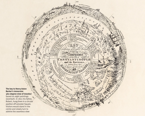 Paying the high price of three shillings each to enter, the observers would make their way down a dark corridor before entering a room where props were so arranged, and the canvas so seamlessly positioned, as to create the effect of “wholeness” and to place them “on the spot”, earning Barker a fortune and sparking a craze across London for similar vistas. The first panorama of a foreign city to be installed here was painted by Barker’s son Henry Aston Barker, and presented in 1801. The cleverly lit view, which the young Barker had carefully painted over a period of months in Constantinople in 1799, was more than simply a linear or narrative representation. It was an attempt to allow visitors to inhabit and explore a painstaking portrayal of the city’s neighbourhoods, with details such as ropemaking and other elements of daily life presented as at once familiar and strange.