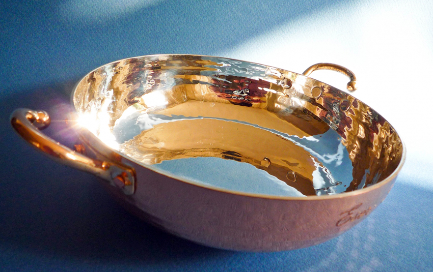 The craftsmanship is in a class of its own. Needless to say, all the painstaking hammering is by hand. Neither press or spinning are involved. It has the perfect finish of wax-cast bronze handles.