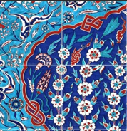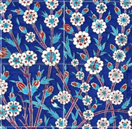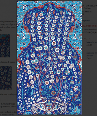 The niche design is filled with glorious sprays of prunus, carnation and tulip, against a dark cobalt blue ground and framed by an arch of turquoise blue. The bole red highlights are true to the original, such as those seen in the Rüstem Pasha Mosque.