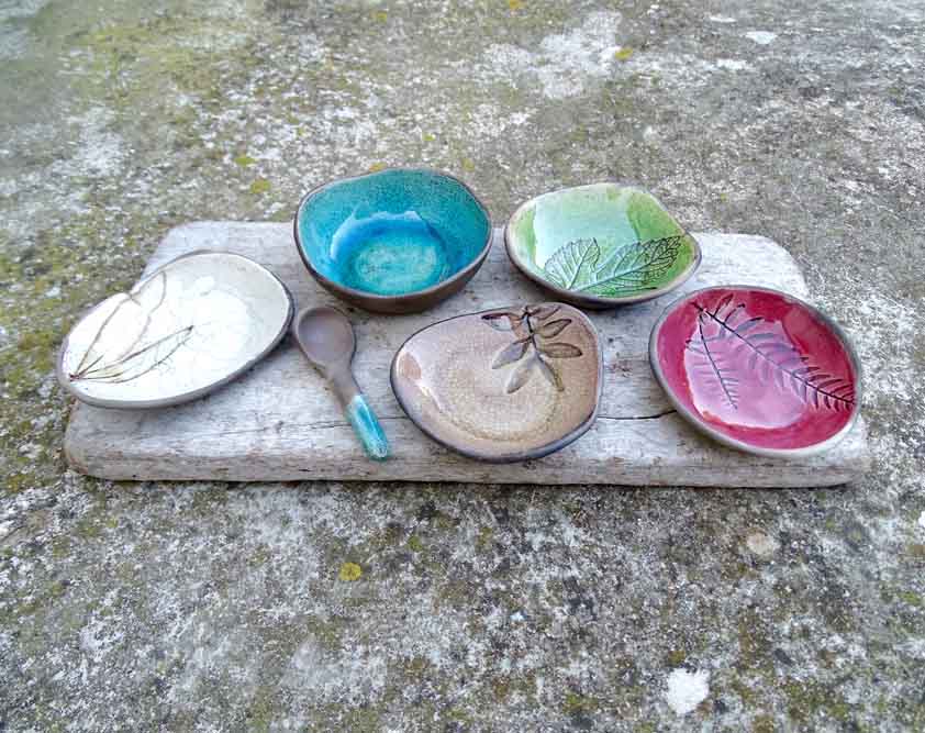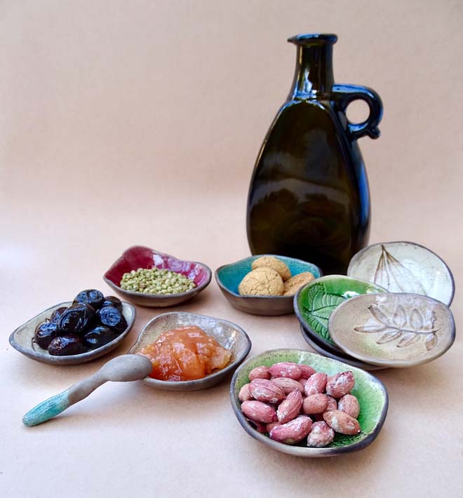 The designs are imprints of Aegean plants – mastic, pink pepper, olive and fig tree leaves. No imprint on the turquoise dish. Each dish has a unique shape and is Raku fired and food safe (lead-free).
