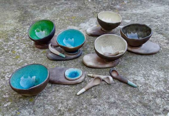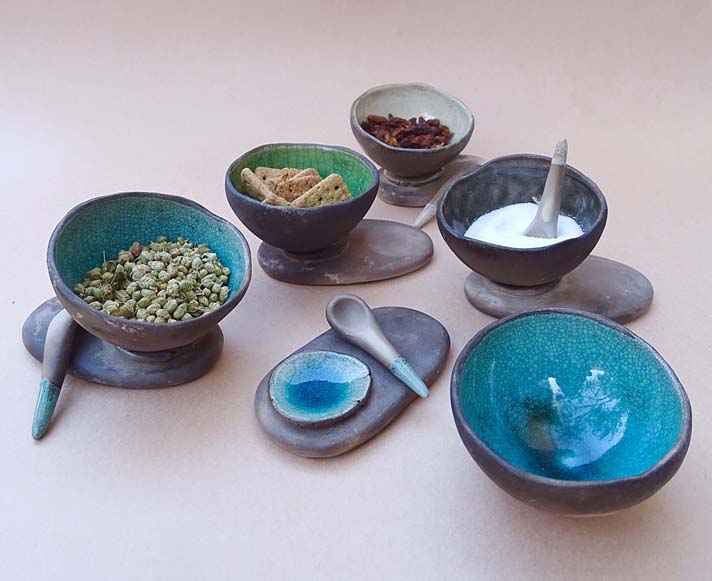 1 pot, 1 tray, 1 spoon. Each set is Raku fired and food safe (lead-free).