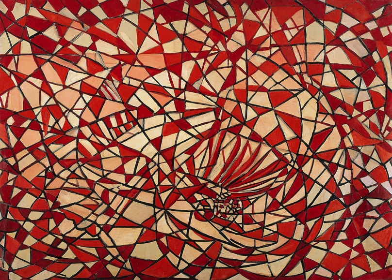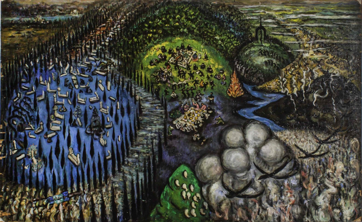 Key to paintings illustrated: Abstract Composition, 1953, 131x182cm; Untitled (portrait), 1964, 150 x 100cm; Three Ways of Lving (War), 1942, 125 x 205cm